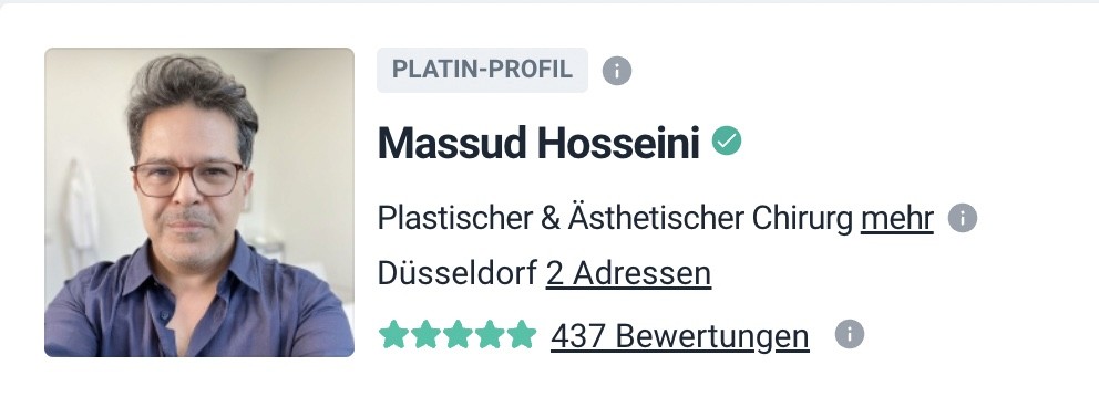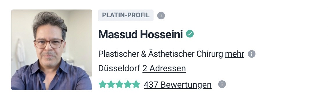 Ich möchte Dr.Hosseini unbedingt und von Herzen empfehlen. Seine kompetente Art, gepaart mit einem sehr wohlwollenden Umgang und das gewisse Maß an Kümmern haben mich dazu bewegt. Drei Wochen nach meiner Oberarmstraffung ist das Ergebnis echt wunderschön, fast keine blauen Flecken oder Schwellungen! Ich bin mit der Behandlung und der Versorgung durch Dr. Hosseini und dem gesamten Team sehr zufrieden...